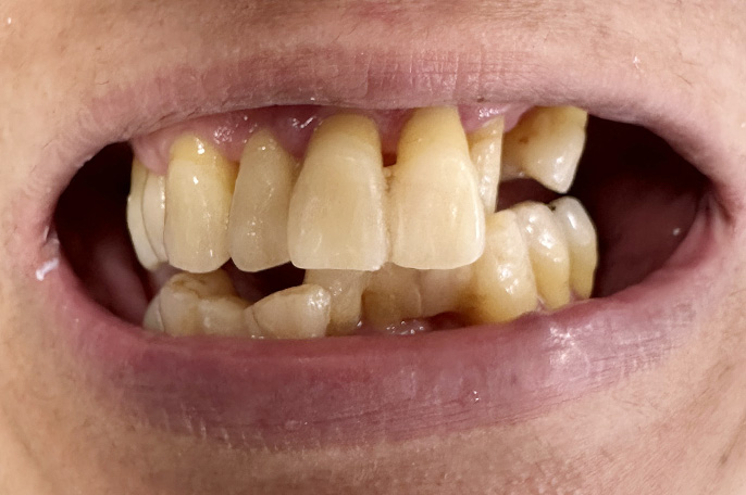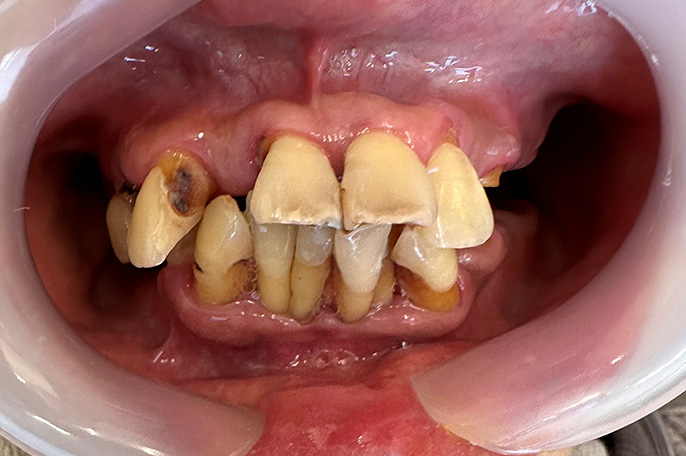 口の中がボロボロで噛めなくて困っている患者さんです。上下ともにオールオン4治療で、上下4本ずつインプラントを入れて即日で仮歯まで装着しました。