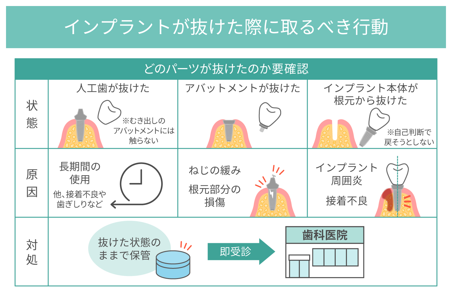 インプラントは顎の骨に固く取り付けられており、簡単には外れません。 全てのパーツが抜けた場合、インプラント周囲炎や接着不良が原因の可能性があります。すぐに歯科医院で問題がないか診てもらいましょう。