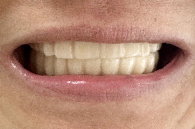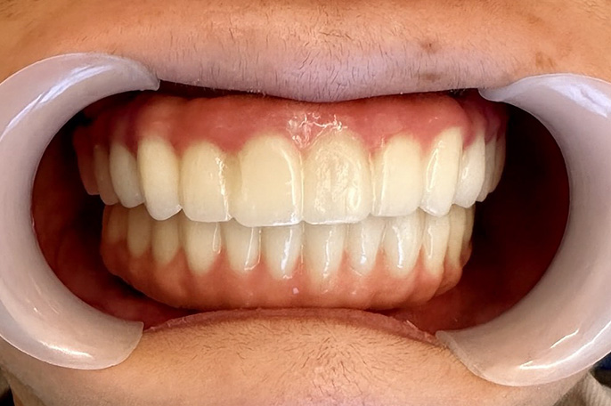 口の中がボロボロで噛めなくて困っている患者さんです。上下ともにオールオン4治療で、上下4本ずつインプラントを入れて即日で仮歯まで装着しました。
